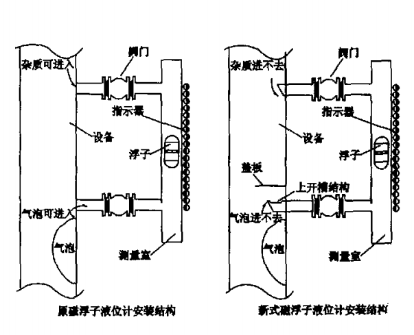 這樣,氣相就不能代替下連接管中的液相,也不能進入液位計的測量室,從而避免了氣泡對測量的干擾和“隨機磁”現象