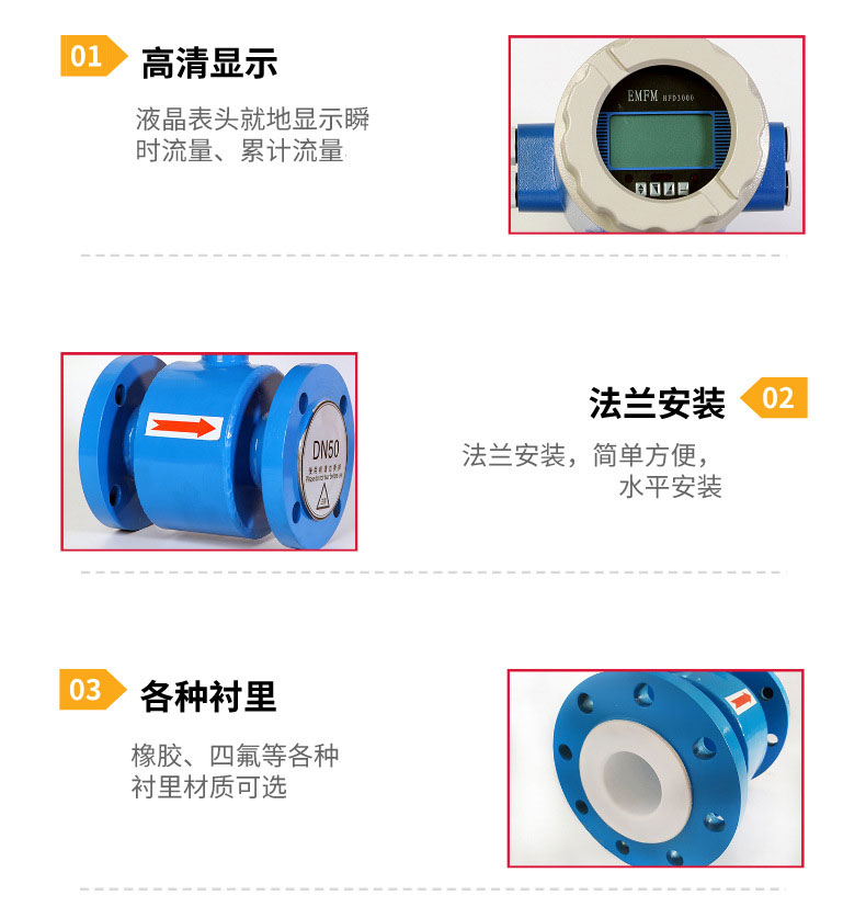 智能型電磁流量計采用**技術。利用恒流低頻三值矩形波或雙頻矩形波勵磁,既有矩形波磁場的優點,又克服了正弦波 磁場的缺點;還可以消除電源電壓波動、電源頻率變化及勵磁線圈阻抗變化所造成的誤差;并有***好的零點穩定性和不受流體噪聲干擾影響。從而具有高穩定性、高可靠性的特點。電磁流量計由傳感器和轉換器組成,傳感器安裝在測量管道上,轉換器可以與傳感器組合連接在一起稱為一體型電磁流量計,轉換器被安裝在離傳感器30米內或100米內的場合,兩者間由屏蔽電纜連接稱為分離型電磁流計。電磁流量計傳感器主要組成部分是:測量管、電***、勵磁線圈、鐵芯與磁軛殼體。