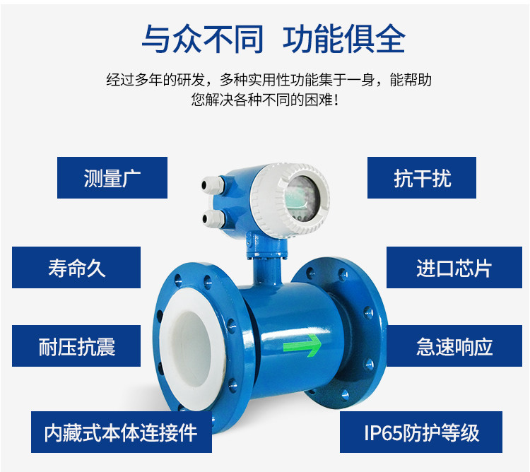3、電磁流量計是一種體積流量測量儀表,在測量過程中,它不受被測介質的溫度、粘度、密度以電導率(在一定范圍)的影響。因此,電磁流量計只需經水標定后,就可心用來測量其它導電性液體的流量。