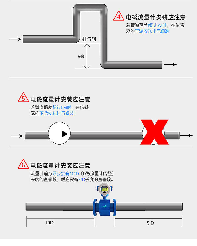 3、流量計的前方zui少要有5×D(D為流量計內徑)長度的直管段,后方zui少要有3×D(D為流量計內徑)長度的直管段;為方便安裝和拆卸,可在電磁流量計后加裝管道伸縮節;