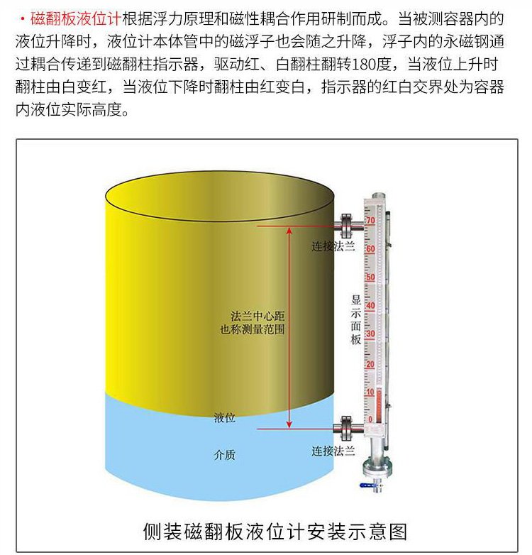 磁翻板液位計的基本知識;磁翻板液位計又稱磁翻板液位計、磁翻板柱液位計和磁浮子液位計。它基于磁耦合原理工作,彌補了玻璃管液位計在高溫高壓下不能工作且易碎的諸多缺點;磁翻板液位計有兩種安裝方式:側(cè)裝和頂裝。無論采用哪種方式,都可以捆綁遠(yuǎn)程傳輸裝置,以便液位計可以在本地顯示液位,并遠(yuǎn)程監(jiān)控液位。