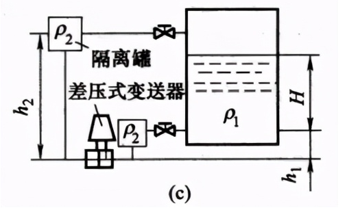 差壓變送器測壓口之間安裝隔離罐,以防止腐蝕性介質(zhì)直接接觸變送器,如圖(c)
