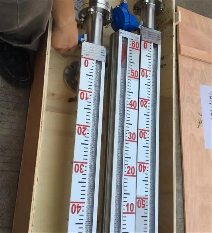 安裝液位計后,打開底部排污法蘭,然后將浮球組件重新安裝到主體管道中。請注意,浮球組件的重型端向上,不能倒置;磁翻板液位計安裝后,需要用磁鋼進行校準,翻柱導軌一次,使零下顯示為紅色,零上顯示為白色。當配備干式彈簧管遠變送器時請注意以下幾點:使干式彈簧管遠變送器靠近液位計的主管(vessel),并用不銹鋼箍固定(禁止使用鐵);遠傳干彈簧管遠變送器的傳感面應朝向并靠近主管;;干彈簧管遠變送器的零位應與磁翻板液位計的零位指示處于同一水平;干彈簧管遠變送器之間的接線顯示儀表或工控計算機應通過保護管或屏蔽雙芯電纜分開敷設;接線盒進線孔敷設后,要求密封良好(demand),以防止干簧管遠變送器因雨水、濕氣等侵入而正常工作。,維護或調試后應及時蓋住接線盒。
