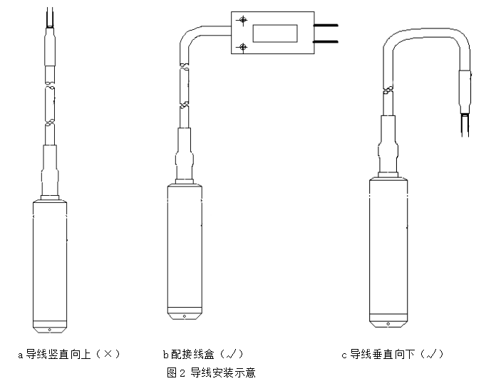 液位變送器終端安裝;客戶終端配備防水透氣的聚合物屏幕。請勿將其拆除,以免影響導體的防水性;如果客戶再次連接,必須采取防水措施,例如密封接線盒(如圖2b所示)等。如果不是或相對簡單,可以彎曲導線并向下安裝(如圖2C所示),以防止水進入并避免故障.