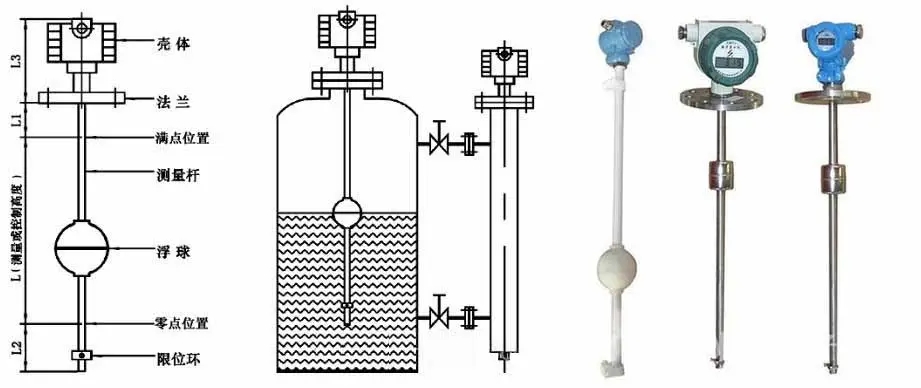 浮球液位計(jì)由兩部分組成:液位傳感器和智能HART板(電流轉(zhuǎn)換器),浮子隨液位同步變化,控制干簧開關(guān)關(guān)閉,使傳感器的電阻成線性變化,然后由轉(zhuǎn)換器將其轉(zhuǎn)換成4~20mA標(biāo)準(zhǔn)電流信號并疊加HART數(shù)字信號輸出。
