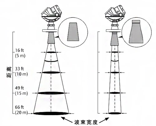 雷達液位計的總波束寬度與設(shè)備的頻率成反比。因此對于同一直徑的天線,如果雷達液位計的頻率提高,波束寬度將低于較低頻率的設(shè)備,狹窄的波束可將管嘴、罐壁和干擾物的影響降至ZUI低。如下圖所示(左側(cè)是6 GHZ的,右側(cè)為26GHZ的)。