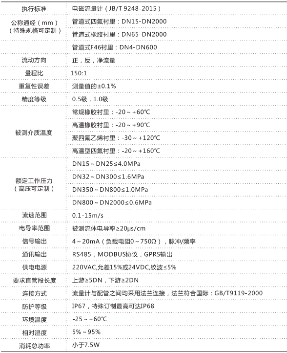三、防腐型電磁流量計技術參數