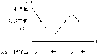 例如 SP2設定為下限報警,SP2=下限設定值,P2h=0,P2c=30,則SP2報警輸出。