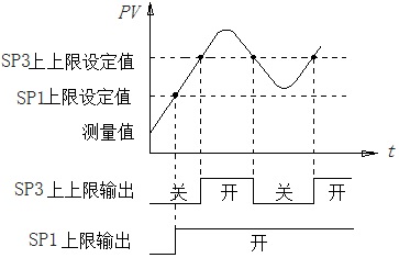 SP3設定為上上限報警,SP3=上上限設定值,P3h=0,P3c=31,SP1設定為上限報警,SP1=上限設定值,P1h=0,P1c=31,則SP3,SP1報警輸出。