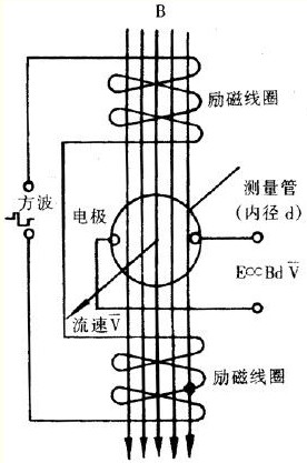 此時(shí),如果具有一定電導(dǎo)率的流體流經(jīng)測量管,將切割磁力線感應(yīng) 出電動(dòng)勢 E。電動(dòng)勢 E 正比于磁通量密度 B、測量管內(nèi)徑 d 與平均流速 V 的乘積,電動(dòng)勢 E(流量信號(hào))由電極檢出并通過電纜送至轉(zhuǎn)換器。
