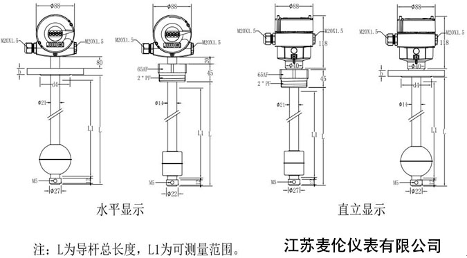 一般來講,標準型浮球液位計共有四種結構尺寸,如上圖所示。圖中左一和左二為水平顯示,左三和左四為直立顯示。上圖左一型號的浮球液位計,其過程連接為法蘭連接,導桿尺寸為Φ21*2,表頭距離法蘭為80mm,浮球為大球。上圖左二型號浮球液位計,其過程連接為螺紋連接,導桿尺寸為Φ14*1,表頭距離螺紋為20mm,浮球為小球。上圖左三型號的浮球液位計,其過程連接為螺紋連接,導桿尺寸為Φ21*2,浮球為小球,用戶可以從上面看到具體的液位。上圖左四型號的浮球液位計,其過程連接為法蘭連接,導桿尺寸為Φ14*1,浮球為大球。