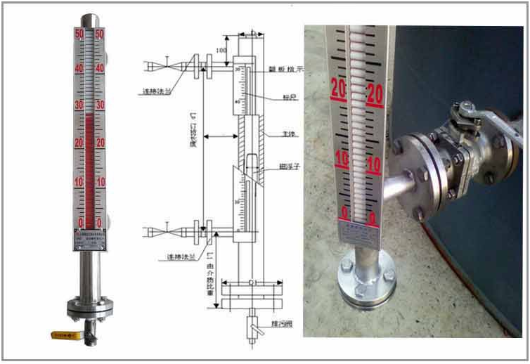 也有主體內(nèi)磁浮子隨液位的升降而上下運(yùn)動(dòng),同時(shí)驅(qū)動(dòng)主體外指示內(nèi)的雙色磁板翻轉(zhuǎn),有液位時(shí)轉(zhuǎn)示紅色、無(wú)液位時(shí)轉(zhuǎn)示白色。紅色和白色之間的界線即代表液位高度。從而使液位指示顯得更加清晰。能用于高溫、防爆、防腐、食品飲料等場(chǎng)合、作液位的就地顯示或遠(yuǎn)傳顯示與控制。產(chǎn)品可以做到高密封、防泄漏和在高溫、高壓、高粘度、強(qiáng)腐蝕性條件下安全可靠地測(cè)量液位,全過(guò)程測(cè)量無(wú)盲區(qū)、顯示醒目,讀數(shù)直觀,并且測(cè)量范圍大,配上液位報(bào)警、控制開(kāi)關(guān),可實(shí)現(xiàn)液位或界位的上下限報(bào)警和控制,配上液位變送器可將液位。界位信號(hào)轉(zhuǎn)換成二線制4~20mADC的標(biāo)準(zhǔn)信號(hào),實(shí)現(xiàn)遠(yuǎn)距離檢測(cè)、指示、記錄與控制。