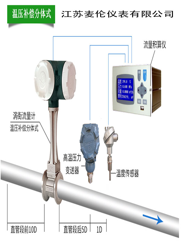 渦街流量計流向標志,禁止反向安裝,保證前后直管段滿足要求,詳見6.2儀表管道安裝要求;緩慢開啟前端閥門,防止產生氣錘或者水錘現象傷害儀表;管道試壓檢漏,確保管道不漏氣;